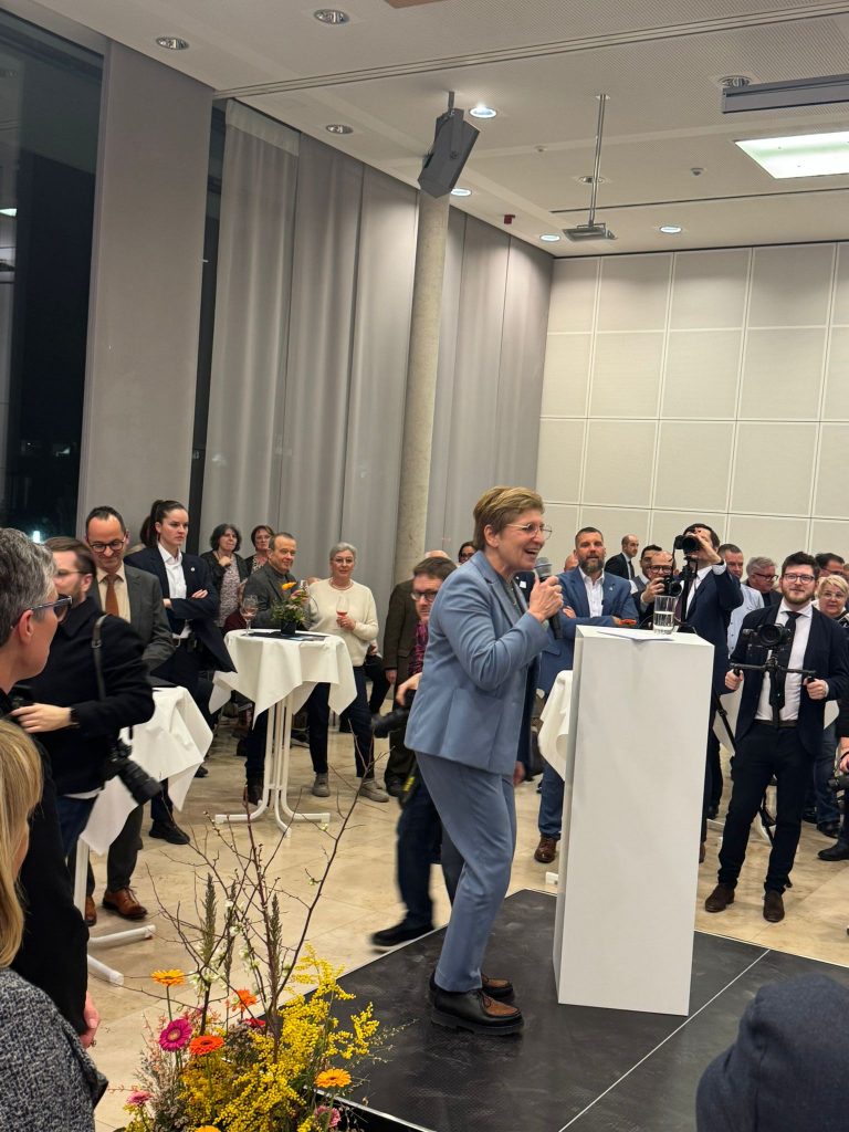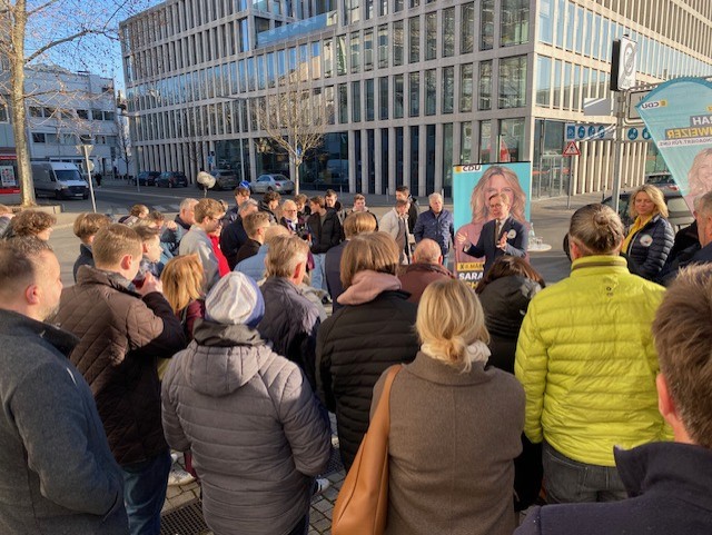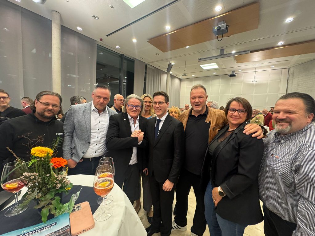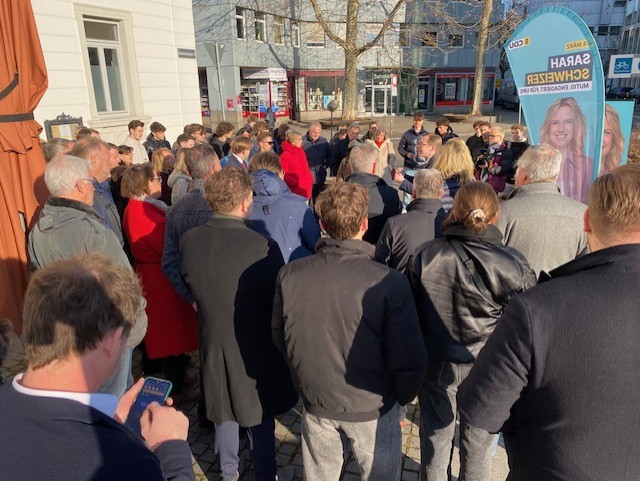 Kommt da überhaupt jemand? Der CDU- Bundestagsabgeordnete und parlamentarische Staatssekretär im Digitalministerium, Philipp Amthor, füllt auch um diese Uhrzeit schnell das Nebenzimmer in der Villa Gutmann in Göppingen. Zehn Minuten vor Beginn der Veranstaltung war der Zustrom Interessierter, darunter auch zahlreiche MIT-Mitglieder, so groß, dass die Gastgeberin, die Landtagsabgeordnete Sarah Schweizer, kurzerhand die Veranstaltung ins Freie auf den Bahnhofsplatz vor die Villa Gutmann verlegte. Rund 100 Interessierte lauschten dem populären Abgeordneten aus Mecklenburg-Vorpommern was dieser zu aktuellen innen- und außenpolitischen Themen zu sagen hatte. Bürokratierückbau – „wir brauchen mehr Realwirtschaft weniger Zettelwirtschaft“, Digitalisierung – „auch in der Verwaltung“, weniger Berichtspflichten im Gesundheitswesen und die Verteidigung demokratischer Grundrechte schnitt der Abgeordnete an. Der Abgeordnete pries zudem seine Gastgeberin, die Landtagsabgeordnete Sarah Schweizer. Sie sei eine Politikerin, die nicht nur durch ihre große Sachkenntnis auffalle, sondern auch die Themen und Probleme beim Namen nenne. Der Staatsekretär rief seine Zuhörer dazu auf, mehr Optimismus, Mut und Zuversicht zu verbreiten. Von der Schlechtrederei und Miesmacherei einer anderen Partei sollte man sich nicht anstecken lassen.